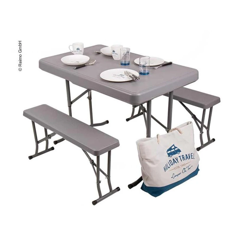 Table extérieure type pique nique de CAMP4 avec bancs intégrés idéal en plein air au camping, en camping-car ou fourgon aménagé.