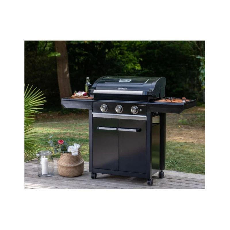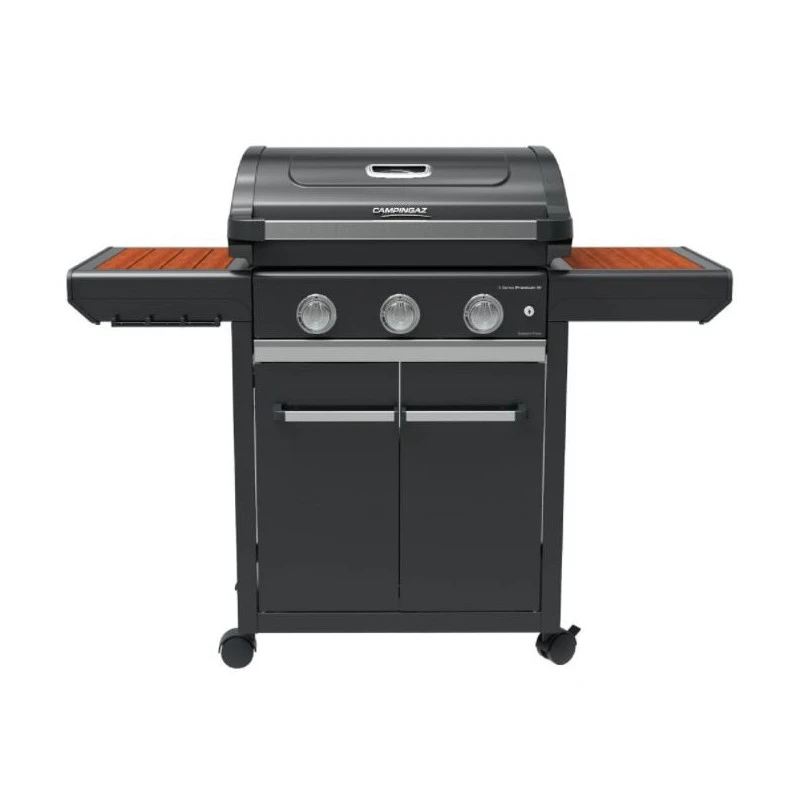 Voici le Premium 3 W de CAMPINGAZ le barbecue à gaz avec couvercle sur 4 roulettes, 3 brûleurs et un système de nettoyage facile InstaClean pro idéal sur la terrasse de la maison, du mobil-home ou en caravane 4 saisons au camping.