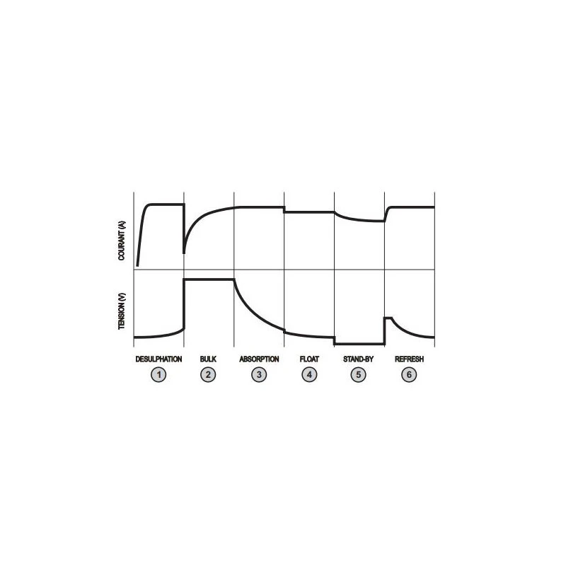 - Refresh : La batterie repart sur une phase de Bulk/Boost pour un maximum de 1H. Cette phase vie a palier le phénomène d’autodécharge de la batterie. Une fois terminé, le chargeur repars sur une phase de floating.
