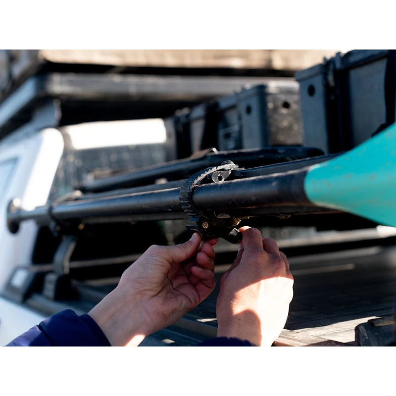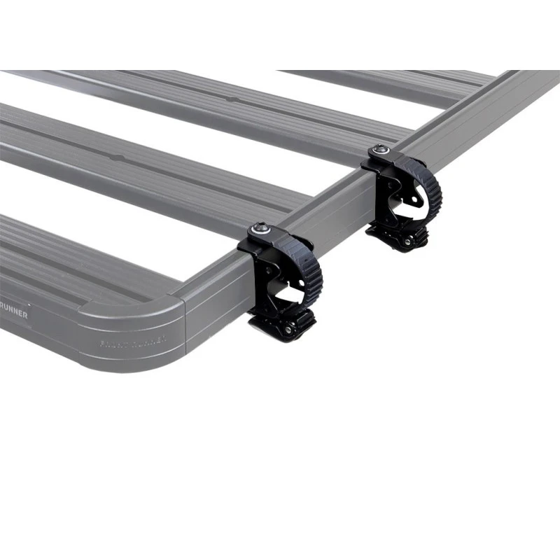 Ce support s’installe très facilement et ne nécessite pas de perçage. Il vous suffit de le placer sur une des barres latérales de la galerie de toit FRONT RUNNER et d’y fixer ensuite votre outil ou équipement de sport.