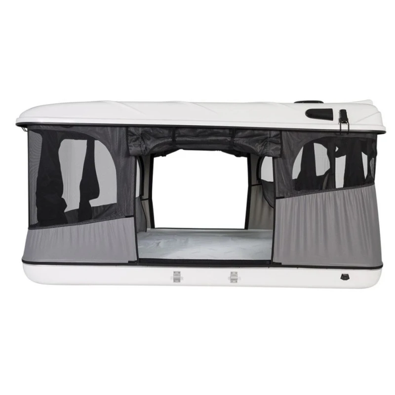 La tente de toit de JAMES BAROUD possède, comme toutes les autres, une coque en fibre de verre ainsi qu’une toile en polyester. Elle s’ouvre facilement grâce à ses puissants vérins. Une fois ouverte, sa toile polyester offre une vision panoramique vers l’extérieur pour profiter pleinement de votre séjour. Sa toile polyester est imperméable à l’eau mais perméable à l’air.