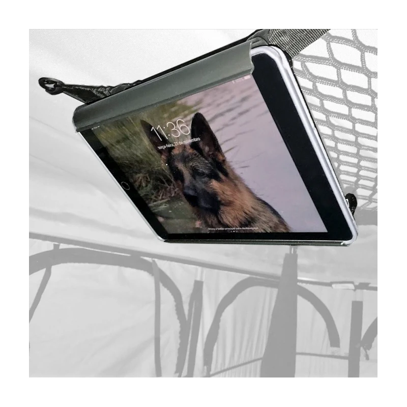 Support de la marque JAMES BAROUD pour suspendre aisément votre tablette au filet de rangement à l’intérieur de la tente de toit. Vous pourrez ainsi regarder vos programmes préférés facilement comme à la maison.