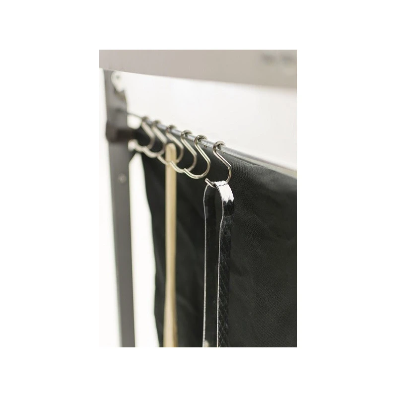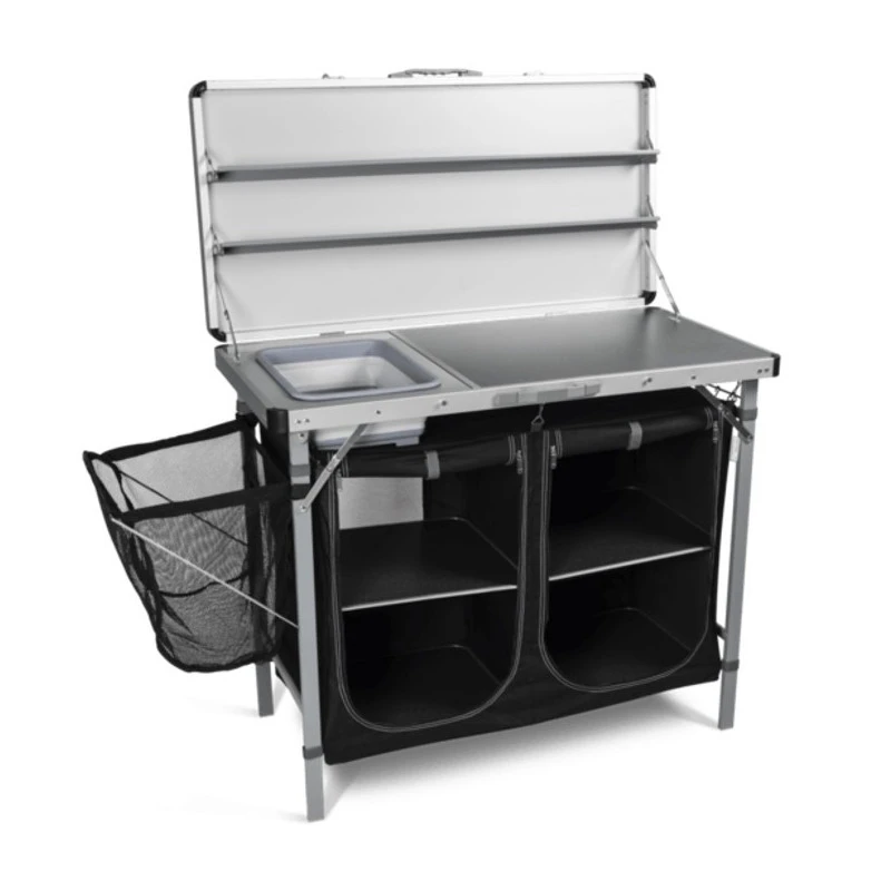 Ce meuble de camping est très bien conçu et regroupe tous les avantages des autres meubles de cuisine habituels en 1 ! Vous disposez d’éléments qui vous permettrons de ranger, de cuisiner et d’organiser votre coin cuisine comme à la maison et ce sans prendre de place sous l’auvent de votre caravane. Cet unité de cuisine comprend donc un meuble de cuisine avec étagères, une poubelle sur le côté droit, des crochets de suspensions sur le côté gauche pour vos serviettes et torchons, un plan de travail pour réchaud ou barbecue gaz, un évier encastré et un espace de rangement supérieur pour stocker vos épices et autres condiments.