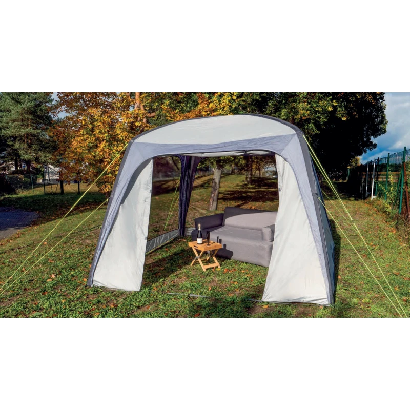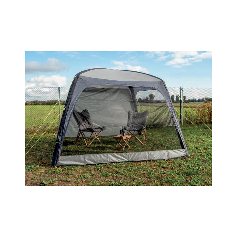 La tonnelle Linosa 350 de chez REIMO est pourvu d’arceaux gonflables qui se mettent en place facilement et rapidement. Cet abri est indépendant et se dispose sur votre zone de campement à l’aide du système d’haubanage fourni.