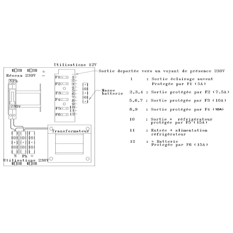Pour faciliter la distribution Ă©lectrique dans le vĂ©hicule amĂ©nagĂ©, le chargeur SHEIBER BIP dispose de 9 sorties 12 V destinĂ©es a alimenter les consommateurs Ă©lectriques : lumière, rĂ©frigĂ©rateur, prise USB etc… Les dĂ©parts sont protĂ©gĂ©s par 6 fusibles plat ATO (standard automobile).